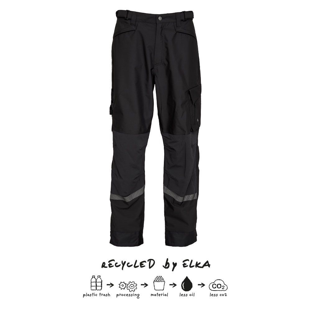 Vindtætte og åndbare regnbukser fra ELKA Rainwear. Bukserne er i et gennemtænkt design med forstærkninger på udsatte steder, store lommer til arbejdsredskaber og med lommer til knæpuder. I bukserne indgår recycled materiale, bl.a. PET-flasker. Bukserne er med stretch, som sikrer optimal bevægelsesfrihed. Bukserne er OEKO-TEX STANDARD 100 certificeret.