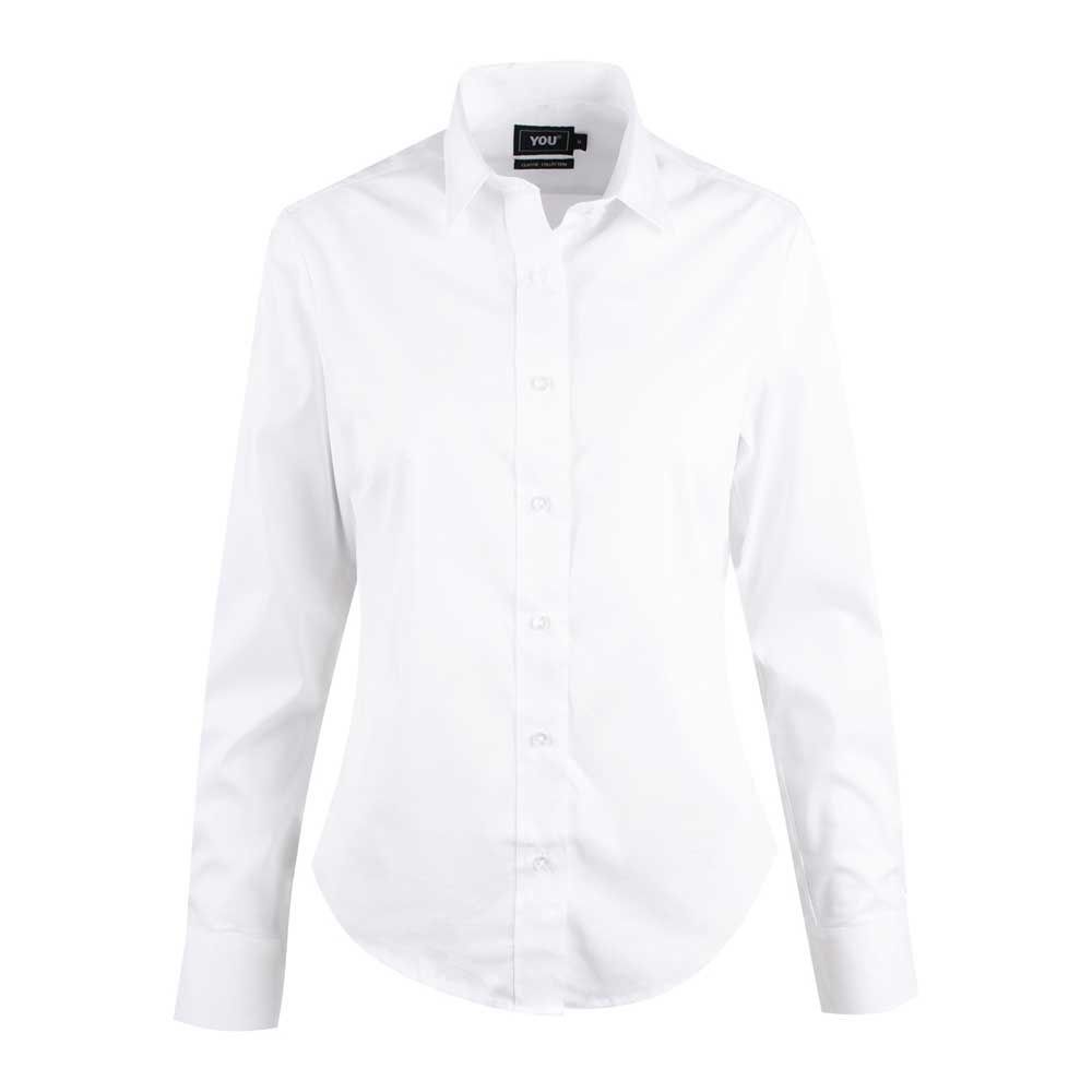Figursyet stretchskjorte med lange ærmer til damer. Skjorten giver et flot og klassisk look. Vi anbefaler at man tager en størrelser større end den man normalt bruger, da skjorten er lille i størrelsen.