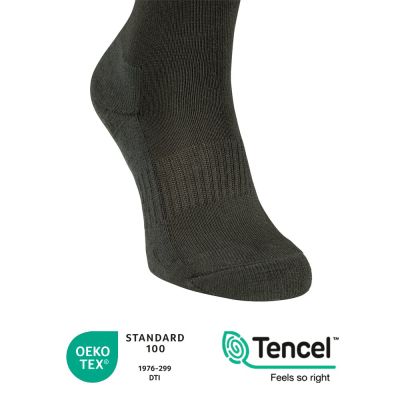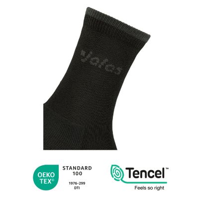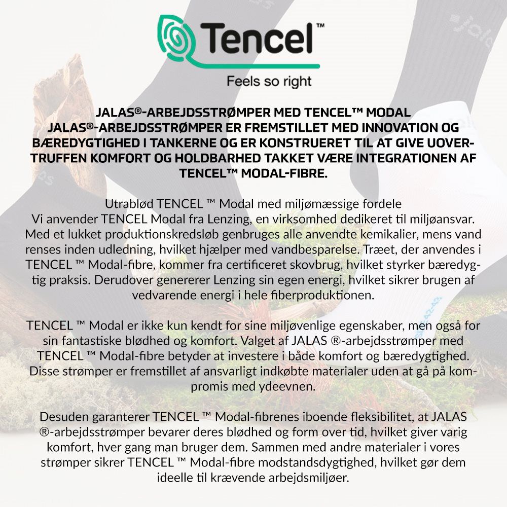 Jalas 8210B er en superblød og behagelig strømpe i Tencel Modal. Det er bæredygtig tekstilfiber som er kendt for sin blødhed, lethed og åndbarhed. Materialet sikrer, at strømperne bevarer sin form og farve efter vask. Strømpen er forstærket med genanvendt polyamid på hæl og tå for ekstra slidstyrke og med frotté på sålen for mere varme og øget komfort. Elastisk svang for særlig god støtte og pasform.