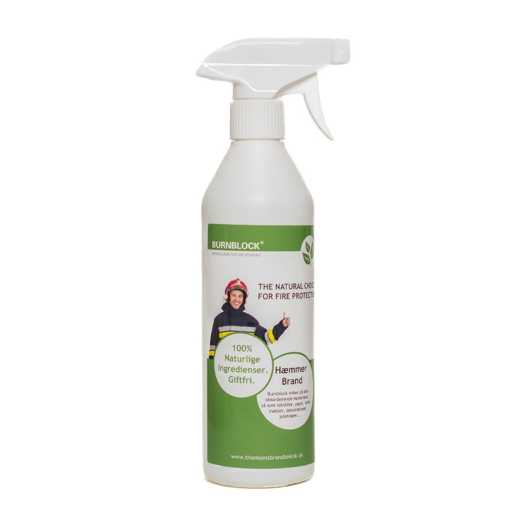 BURNBLOCK er certificeret efter EUs højeste brandstandarder og er velegnet til alt absorberende materiale som gardiner, alterduge, tæpper, juletræer, loftsbjælker, telte, møbler og udsmykning – både ude og inde. Sprayen er nem at påføre og 100 % naturlig, bionedbrydelig og ufarlig for mennesker – selv hvis den kommer i kontakt med hud eller øjne.