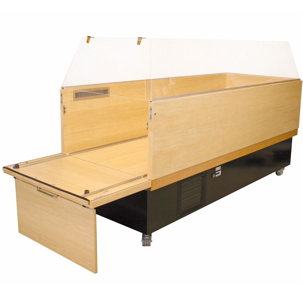 Køleboksene har mørktonede trapezformede plexiglasruder i toppen, der let kan klappes op efter behov.