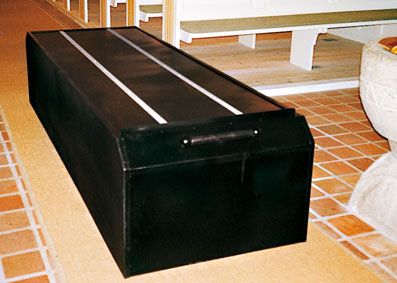 Katafalken er med runde hjørner, monteret med alu-skinner og 4 store luftgummihjul. som gør den let at køre med.