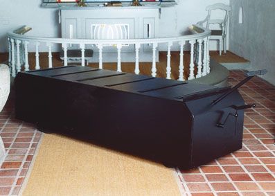 Katafalken er med runde hjørner, monteret med ruller og 4 store luftgummihjul, som gør den let at køre med.