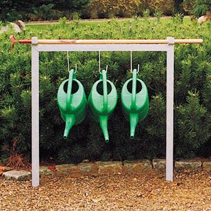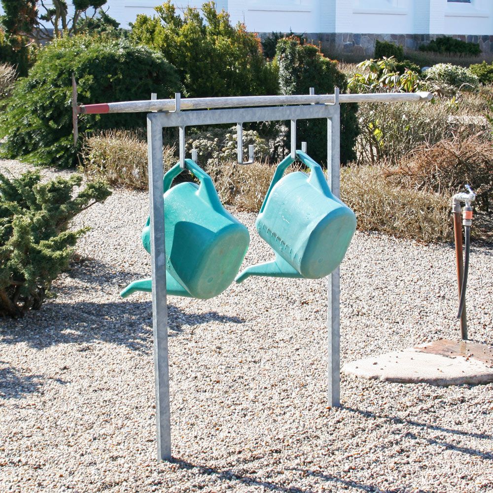 Forsynet med 3 vandkandeholdere samt plads til vandretliggende redskaber øverst på stativet.
