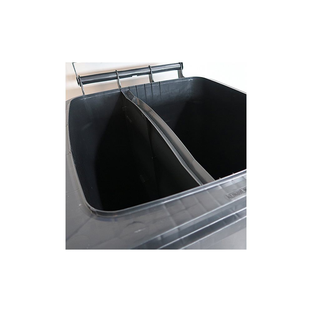 Den 2-hjulede affaldsbeholder med skillevæg er velegnet til affaldssortering af alle gængse affaldsfraktioner. Beholderen kan med en skillevæg deles i to, så der kan indsamles flere affaldsfraktioner i samme beholder.
