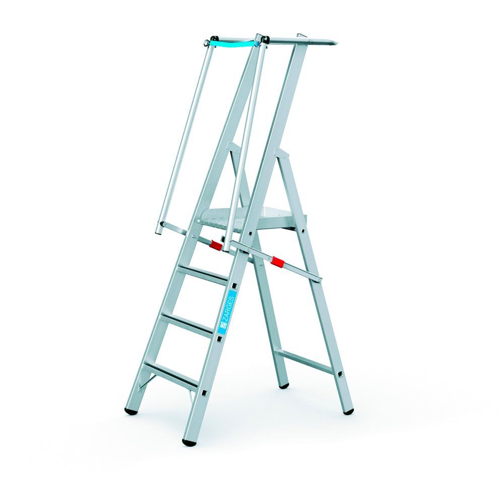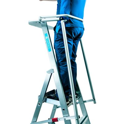 Med denne montagetrappestige opnår du optimal sikkerhed. Den brede platform og sikkerhedsgelænder giver dig god stabilitet, samt muligheden for at udføre tohåndsarbejde. Med de skridsikre trin opnås sikker op og nedstigning.