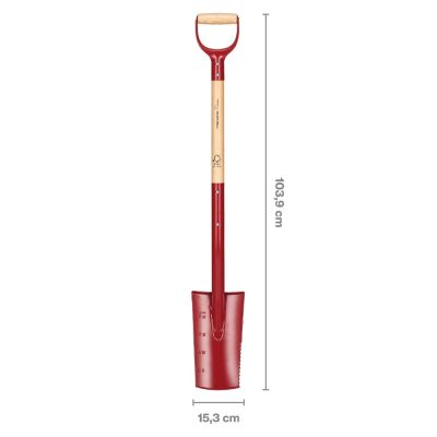 Kvalitetsmaterialerne og den svejsede konstruktion sikrer et slidstærkt redskab med lang levetid. Spadens blad er lavet af borstål for ekstra styrke, og målangivelsen på bladet viser den præcise dybde, når du graver.
