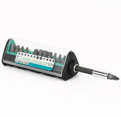 Indeholder 13 dele: PH1+2+3, PZ1+2+3, TORX T15+20+25, Unbrako 5+6 mm, lige kærv 0,8+5,5 mm samt magnetisk bitholder.