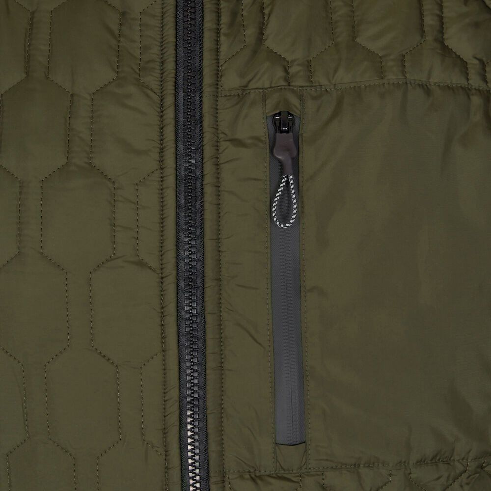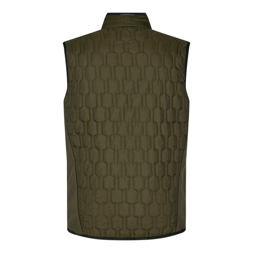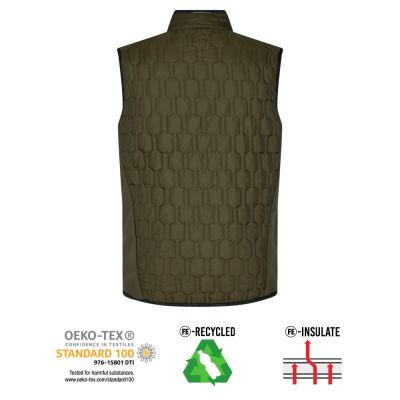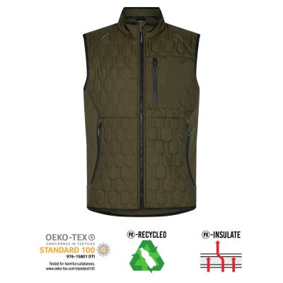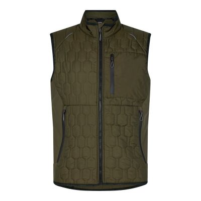 Let quiltet vest der er kombineret med softshell. To sidelommer samt brystlomme lukket med lynlås. 2 indvendige lommer lukket med velcro. Vesten har elastisk kantbånd i kraven, ærmegab og i bunden. Reflekspipings for øget synlighed.