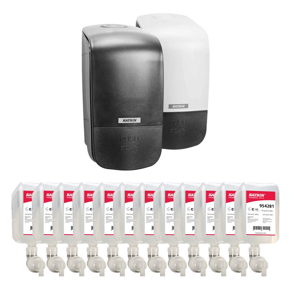 Kom godt i gang med dette start sæt fra Katrin med flot sæbedispenser og 12 stk. dunke foam sæbe