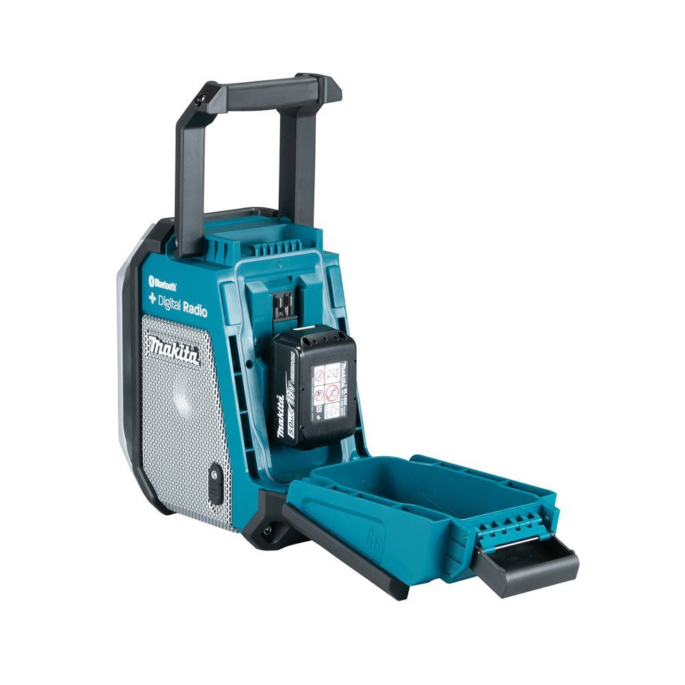 Bluetooth og DAB+ arbejdsradio med Subwoofer højtaler i bunden. IP64-klasse. Mulighed for tilslutning af MP3/iPod/iPhone. Bluetooth-funktionen giver mulighed for tilslutning til din musikafspiller. USB-tilslutning. Bruger Makita batterier fra 10,8V -18V eller net adapter (medleveret).