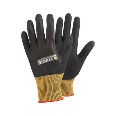 Syntetisk handske, nitrilskum/vandbaseret PU, dyppet på håndfladen, nylon, spandex, 15 gg, sandet overflade, Cat. II, sort, gul, tåler kontaktvarme op til 100°C., til monteringsarbejde