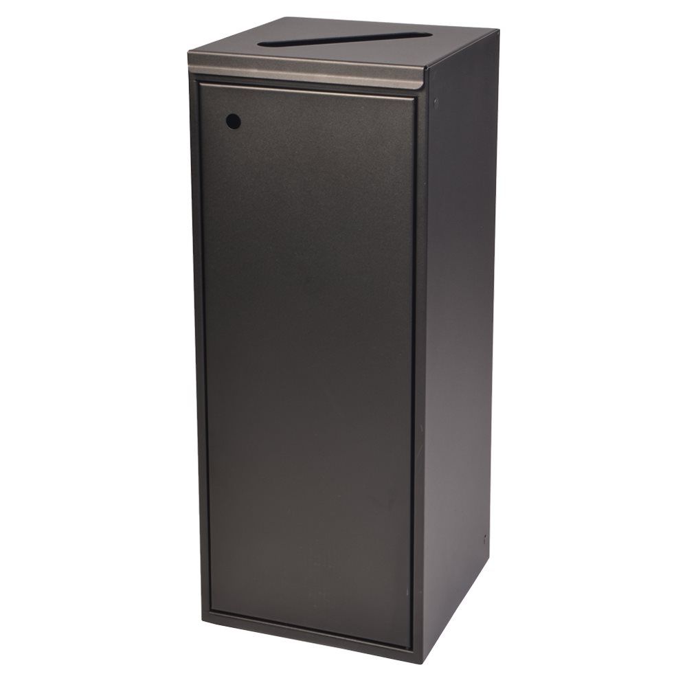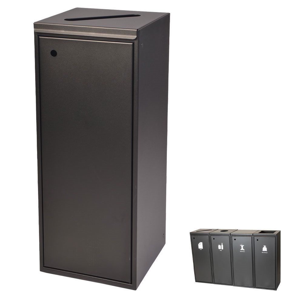 Stilren affaldsbeholder til papirindkast i pulverlakeret stål. Denne serie af affaldssbeholdere giver mulighed for at sammensætte en løsning efter behov til affaldssortering. Man kan via hullerne der er placeret i top og bund i siderne, nemt tilkoble flere stativer alt efter hvor mange affaldsfranktioner man ønsker. Affaldsbeholderne kommer med forskellige låg og indkasthuller til flere varianter af affaldsfraktioner.
