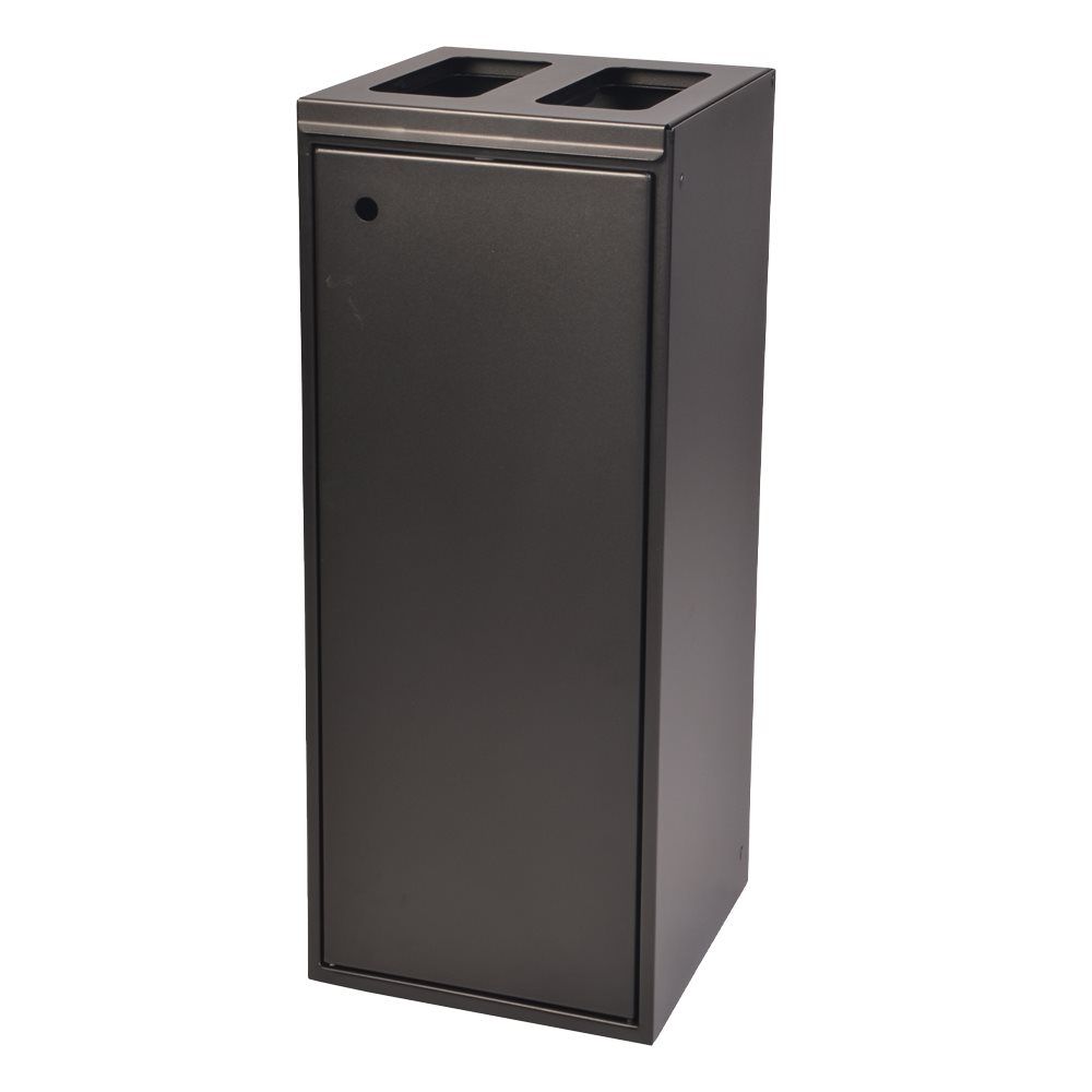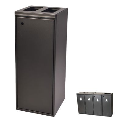 Stilren affaldsbeholder i pulverlakeret med 2 rum á 60 ltr. Er der behov for sortering af mindre mængder affaldsfraktioner er denne en rigtig god løsning. Brug piktogrammer til at vise brugeren hvor affaldet skal sorteres.