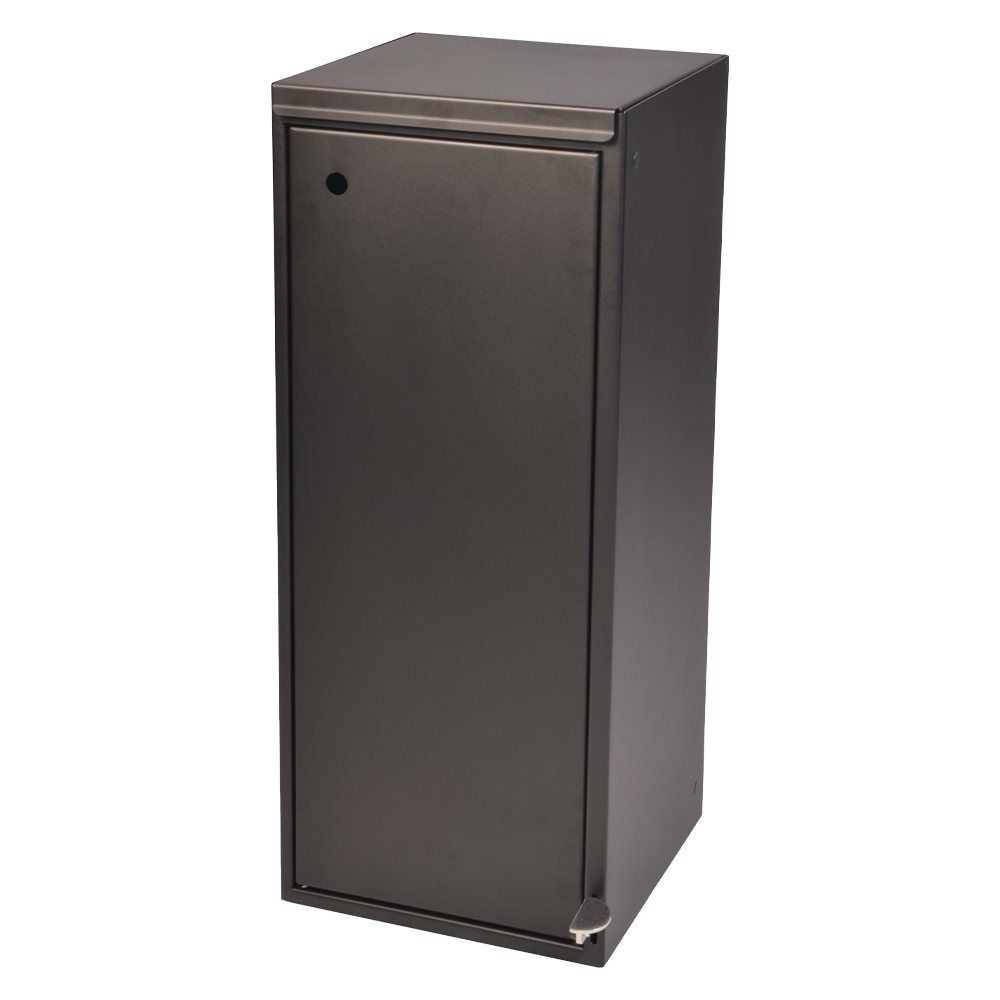 Stilren affaldsbeholder med fodpedal. Affaldsbeholderen er med lukket låg som åbnes via fodpedalen. En god affaldsbeholder i metal som kan anvendes både indedørs og udendørs. Man skifter nemt posen åbne frontlågen.